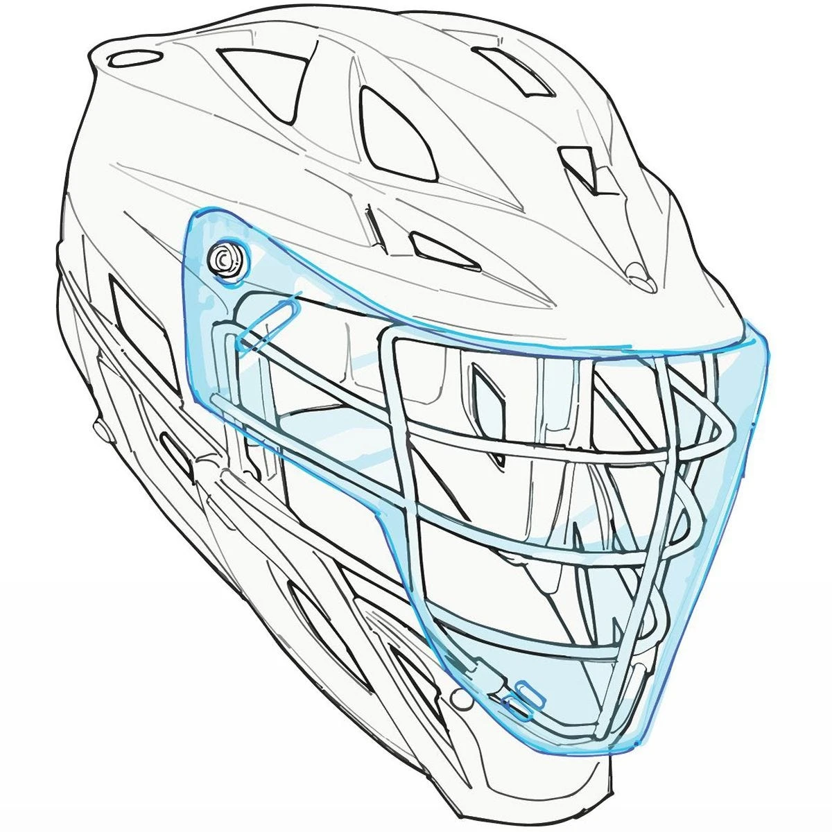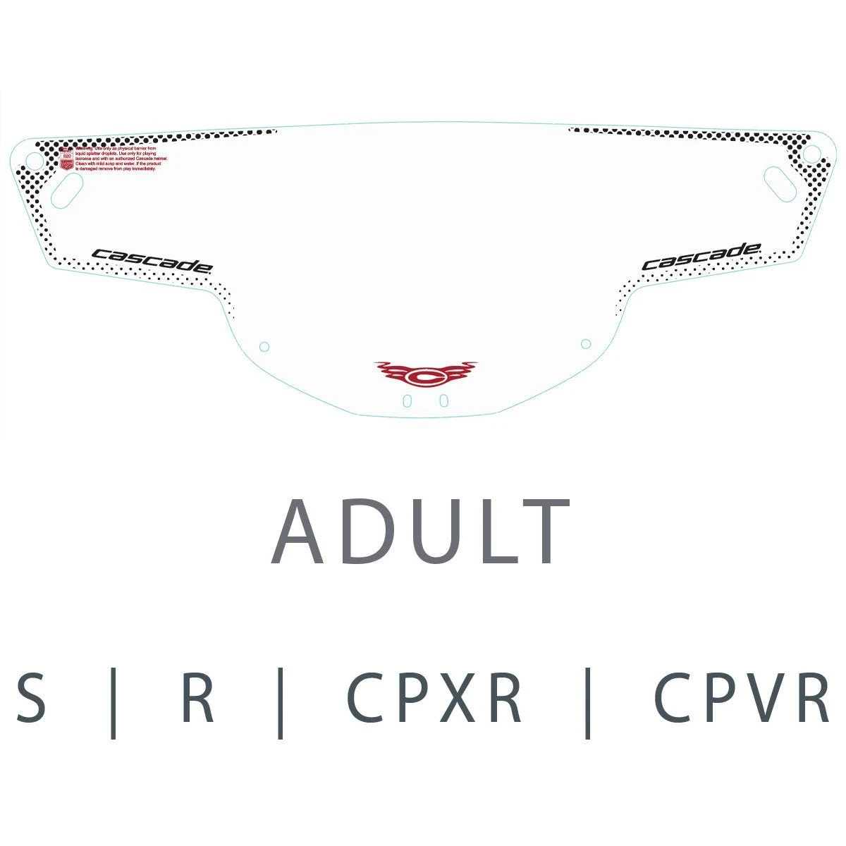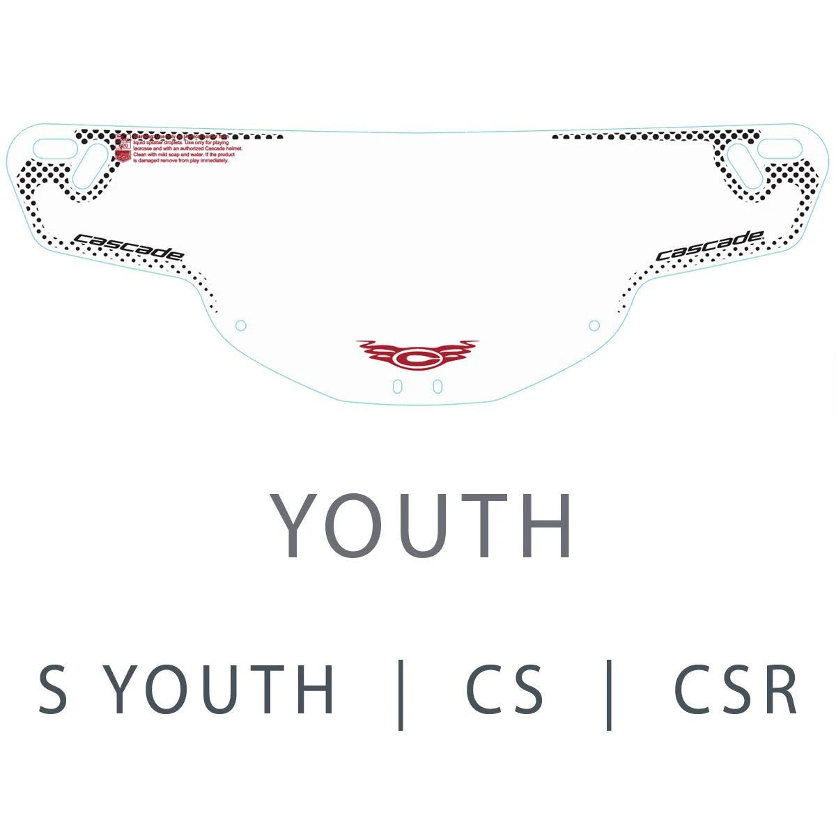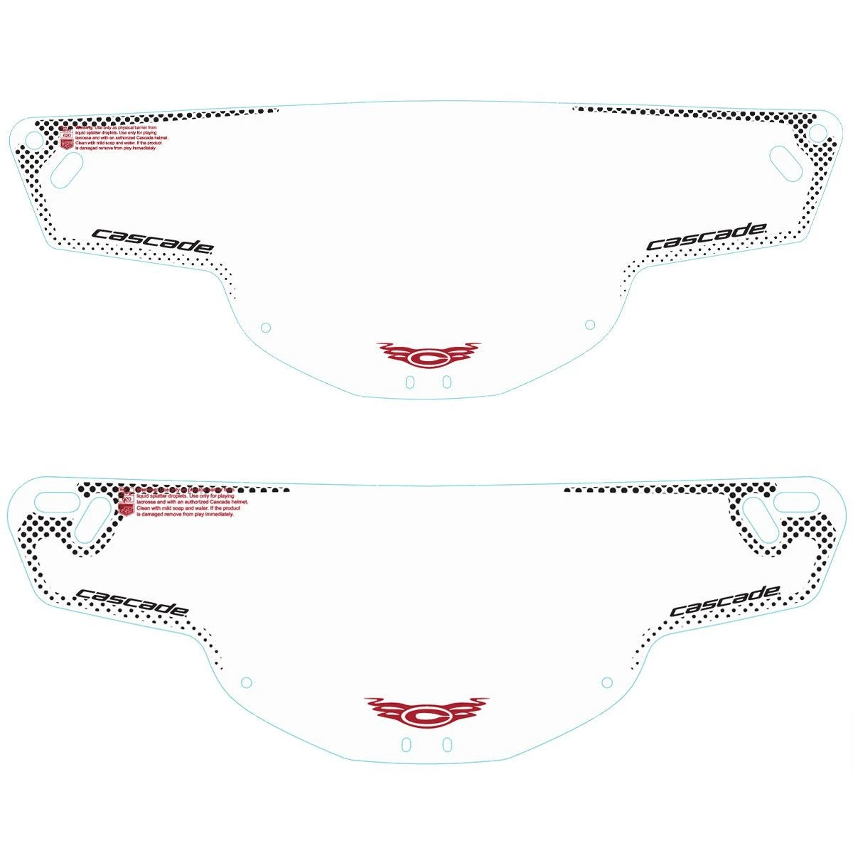 WARNING: USE ONLY AS PHYSICAL BARRIER FROM LIQUID SPLATTER DROPLETS. USE ONLY FOR PLAYING LACROSSE AND WITH AN AUTHORIZED CASCADE HELMET. DO NOT USE AS PROTECTION AGAINST OPEN FLAMES AND SPARKS. CLEAN WITH MILD SOAP AND WATER. TO DISINFECT FOLLOW GOVERNMENT GUIDELINES. IF THE PRODUCT IS DAMAGED REMOVE FROM PLAY IMMEDIATELY.